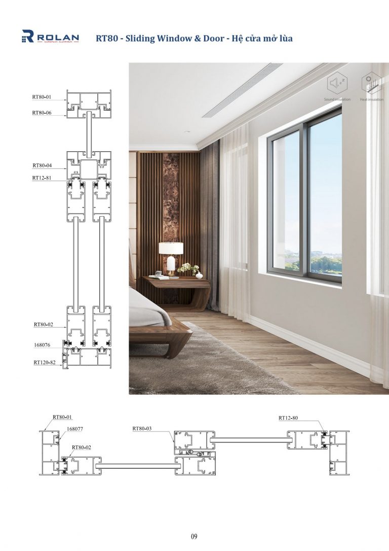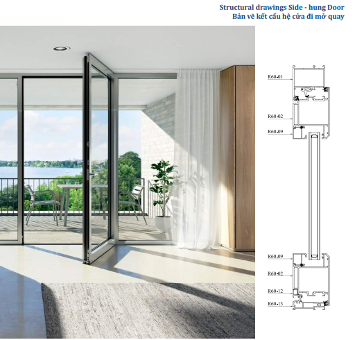– Nhôm Rolan rãnh C cầu cách nhiệt theo tiêu chuẩn châu Âu, thanh profile 2 màu: Màu xanh đen mặt bên ngoài, màu vân gỗ mặt bên trong.